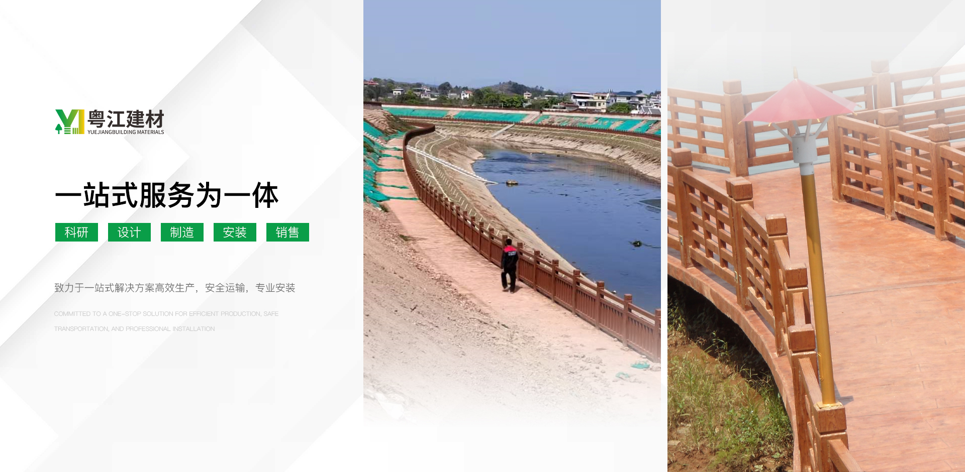 江門市粵江建材有限公司隸屬于中山市鴻文園林景觀工程有限公司(前身為成立于2010年——中山市三圣園林景觀工程有限公司,2021年更名為中山市鴻文園林景觀工程有限公司)旗下子公司,成立于2022年,公司坐落于粵港澳大灣區重要節點城市—鶴山市,占地10余畝,現有員工50余人。是一家專業從事園林護欄設計及施工一體化的園林景觀工程公司,公司擁有仿木、仿石、仿竹、鑄造石四大系列產品,主營產品有:河道護欄、橋梁護欄、仿木護欄、仿漢白玉護欄、仿石護欄、鑄造石護欄、仿竹護欄、仿木護岸樁、仿木花架、仿木花箱、仿木地板、組合護欄、棧橋等景觀產品。產品涉及水利建設、景區建設、城鎮園林建設、小區美化建設、新農村改造等景觀裝飾。